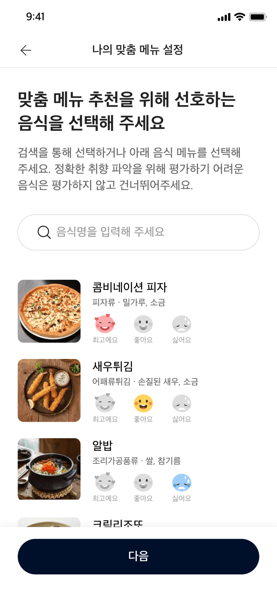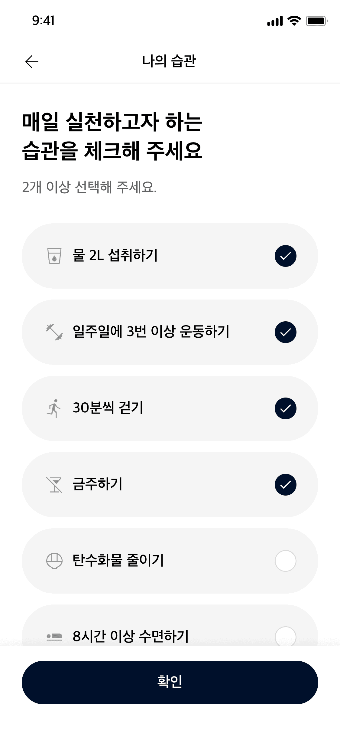 생활 습관과 건강 상태를 효율적으로 수집하기 위해 사용자의 답변에 따라 질문이 최적화되는 단계별 인터랙티브 폼 및 챗봇 UX 설계.