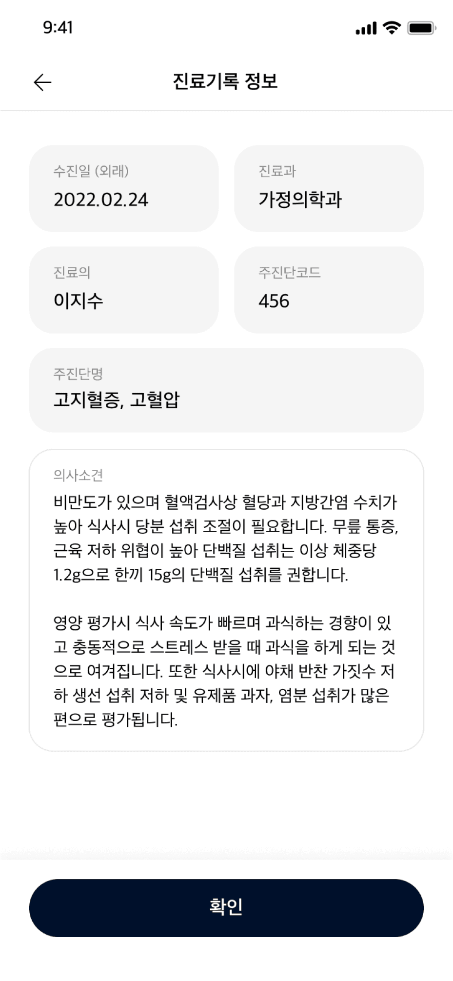사용자의 병원 진료 기록과 일상 건강 데이터를 하나로 연결해 보다 효율적인 건강 관리를 돕는 통합 헬스케어 플랫폼입니다. 이 서비스는 식단, 체중, 활동 등 다양한 데이터를 간편하게 기록하고, 이를 기반으로 개인의 건강 상태를 직관적으로 확인할 수 있도록 설계되었습니다.