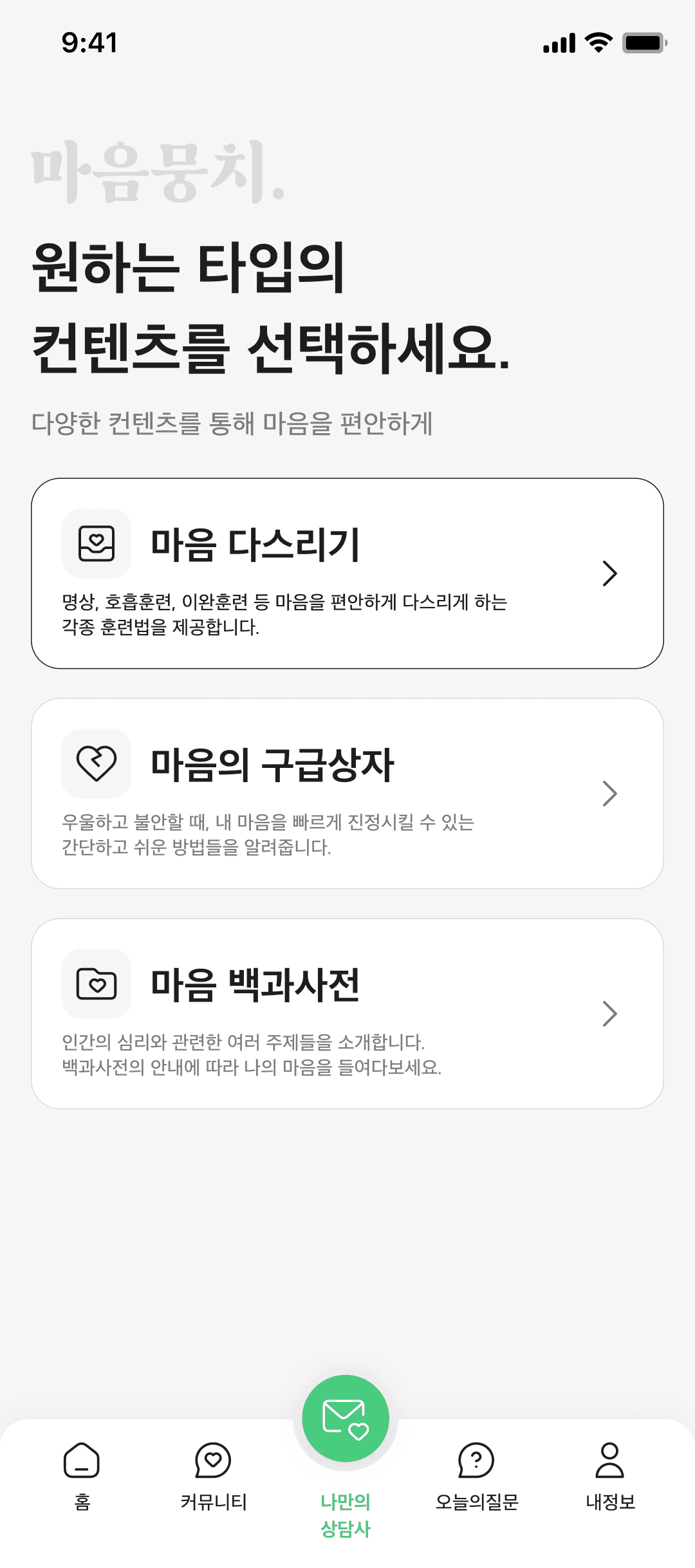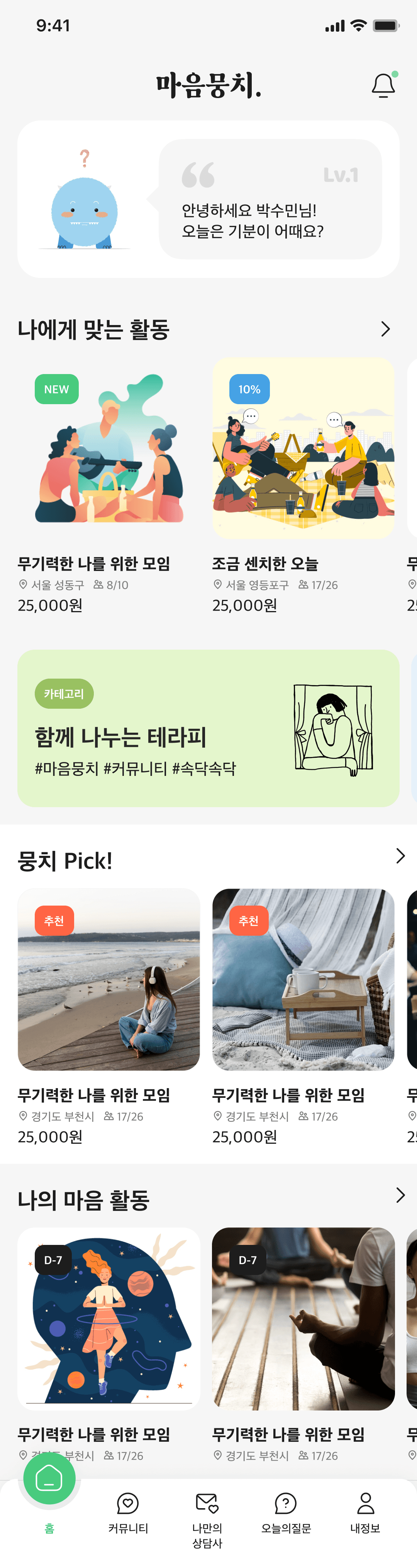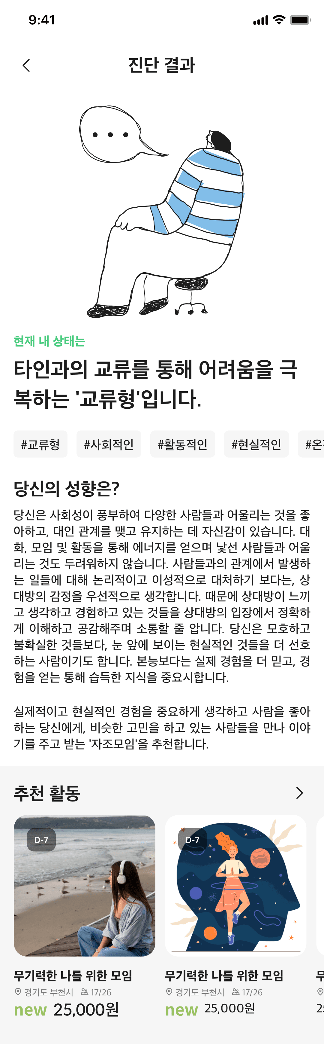 단순한 진단을 넘어 실제 의료 현장 데이터와 커뮤니티 활동이 결합된 고도화된 멘탈케어 플랫폼입니다. 자가 진단, 전문가 챗봇 상담, 오프라인 소모임 연결까지 아우르며 심리 데이터 분석부터 회복 중심 커뮤니티 경험까지 하나의 흐름으로 설계했습니다.