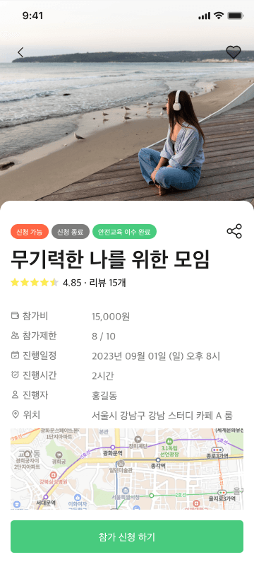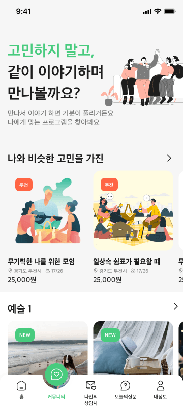 진단 결과 및 관심사가 유사한 사용자들을 매칭하여 유대감을 형성하고, 정서적 지지를 얻을 수 있는 온/오프라인 소모임(Group Care) 플랫폼 제공.