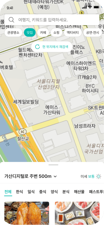 카테고리 필터를 통해 지도 위에서 주변 명소를 실시간으로 탐색할 수 있는 인터페이스 제공