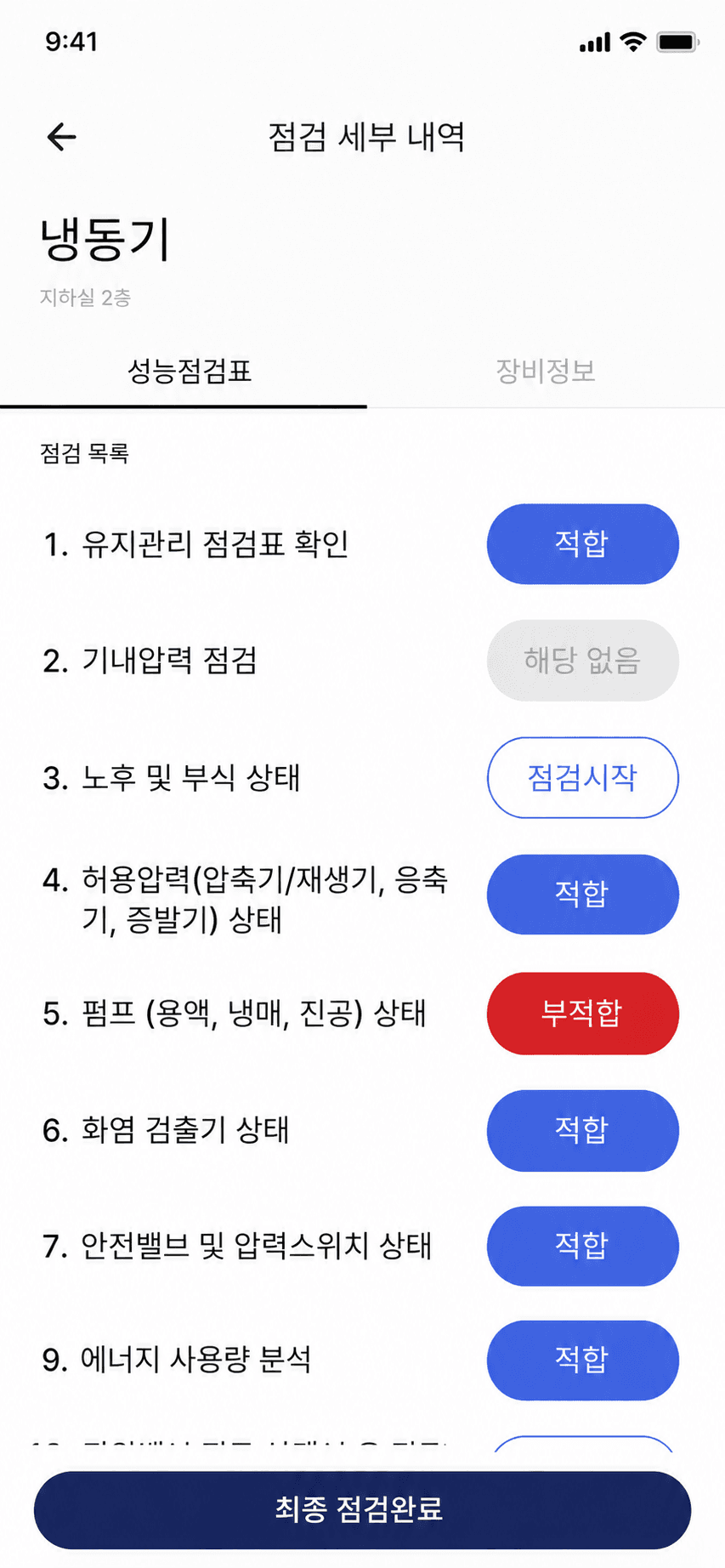 수기 점검을 대체하는 디지털 체크리스트를 통해 점검 누락을 방지하고 데이터 정합성을 확보.