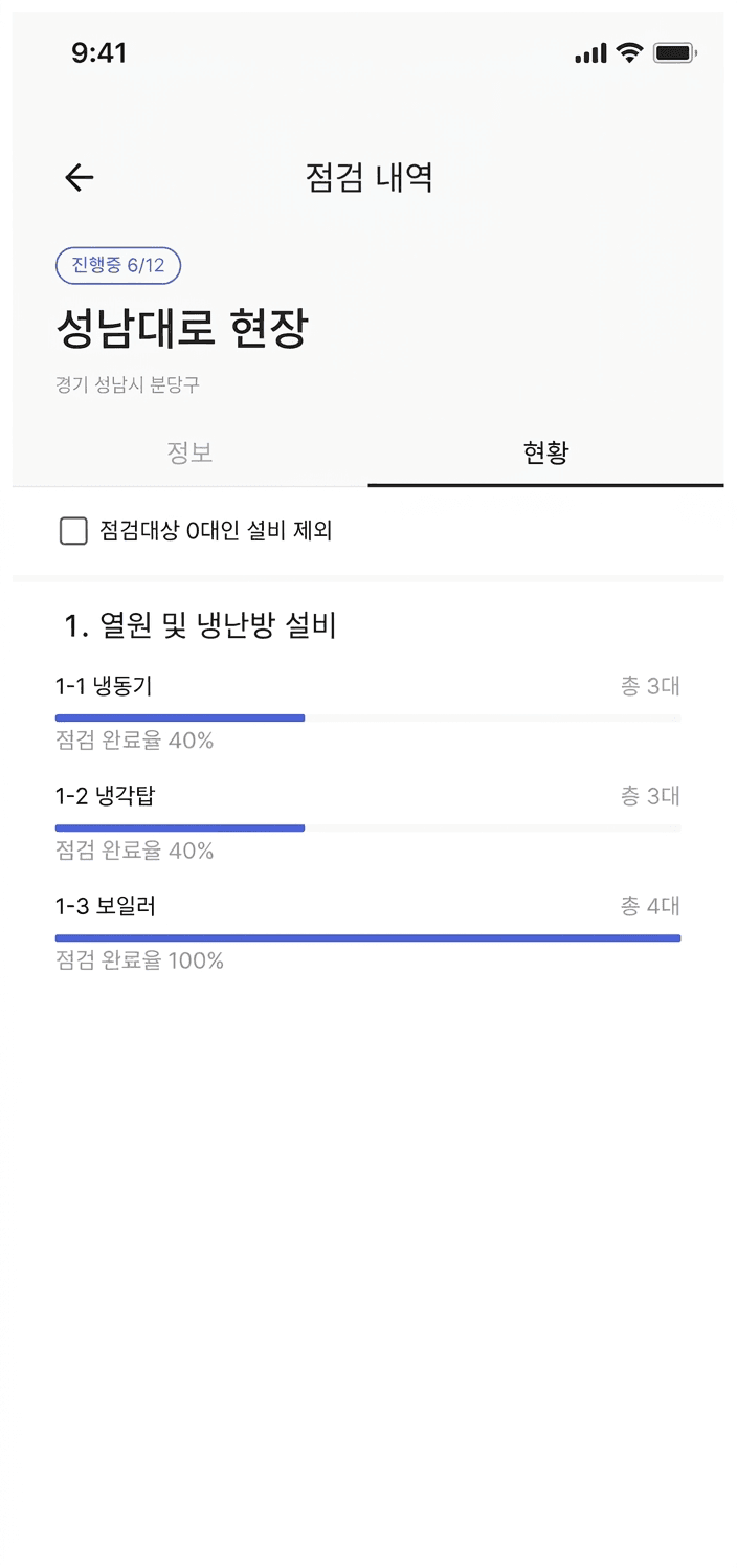 현장의 점검 기록이 사무실의 전략이 되는 시설물 성능 최적화 통합 솔루션입니다. 모바일 점검 결과를 관리자 웹과 실시간으로 연결하여 점검 누락을 방지하고 설비 이력 기반의 예방 정비까지 지원하도록 설계했습니다.