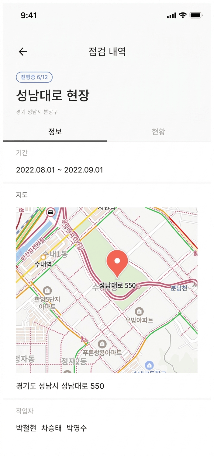 현장 작업자의 모바일 점검 결과가 관리자 웹에 즉시 공유되어 특이사항 발생 시 신속한 의사결정 지원.