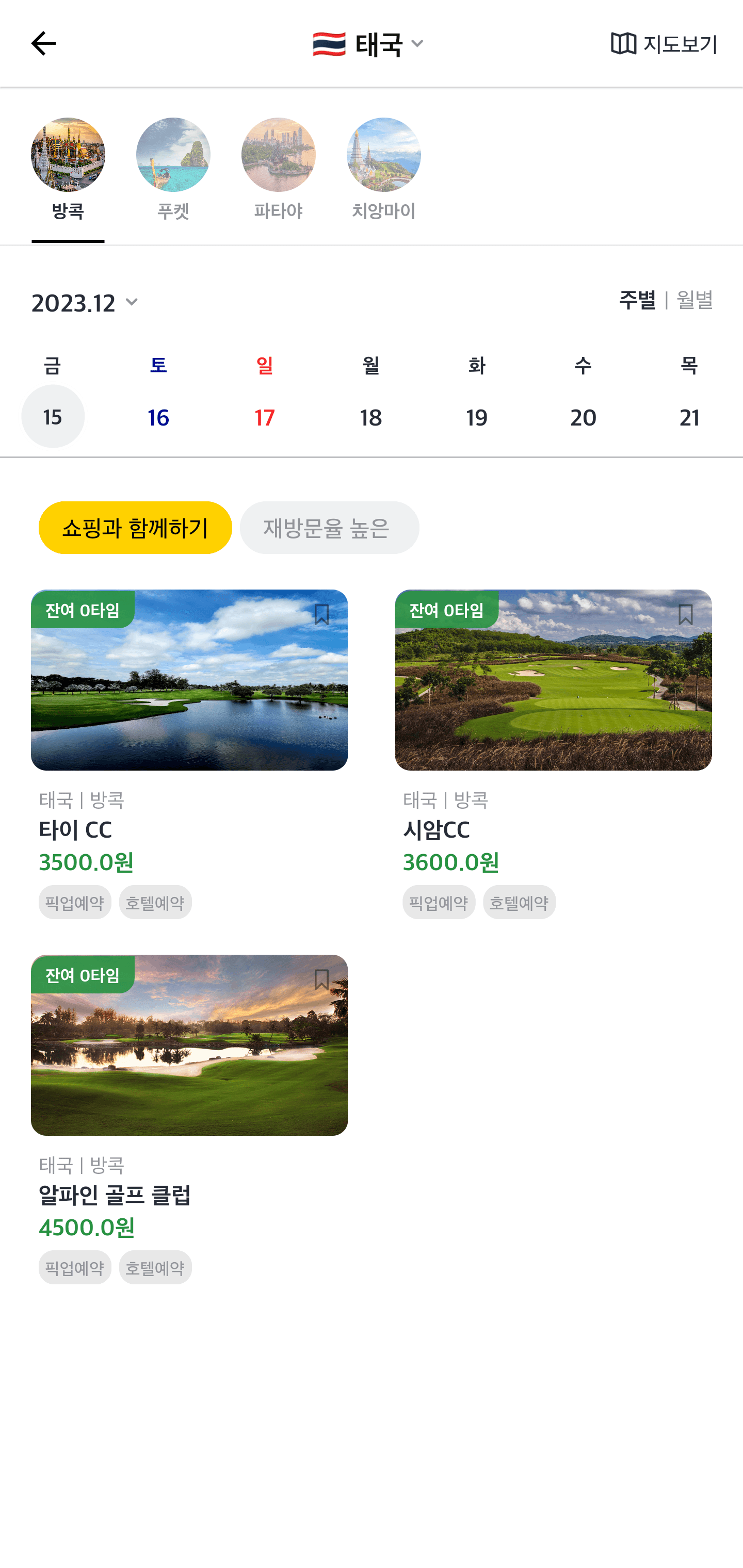 사용자의 위치 또는 여행 목적지를 기준으로 인근 인기 골프장 및 패키지 추천