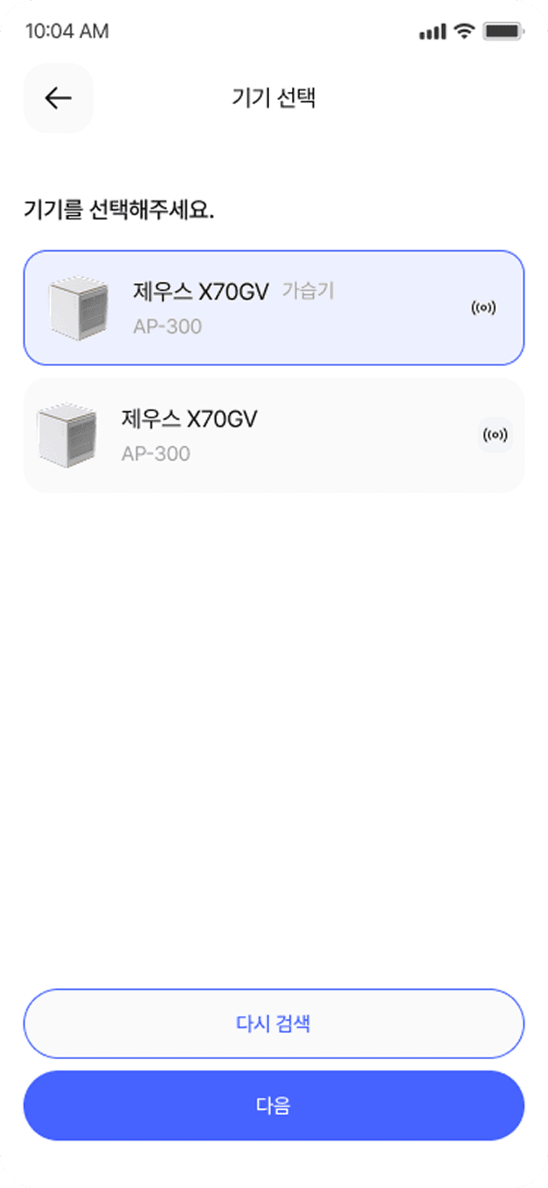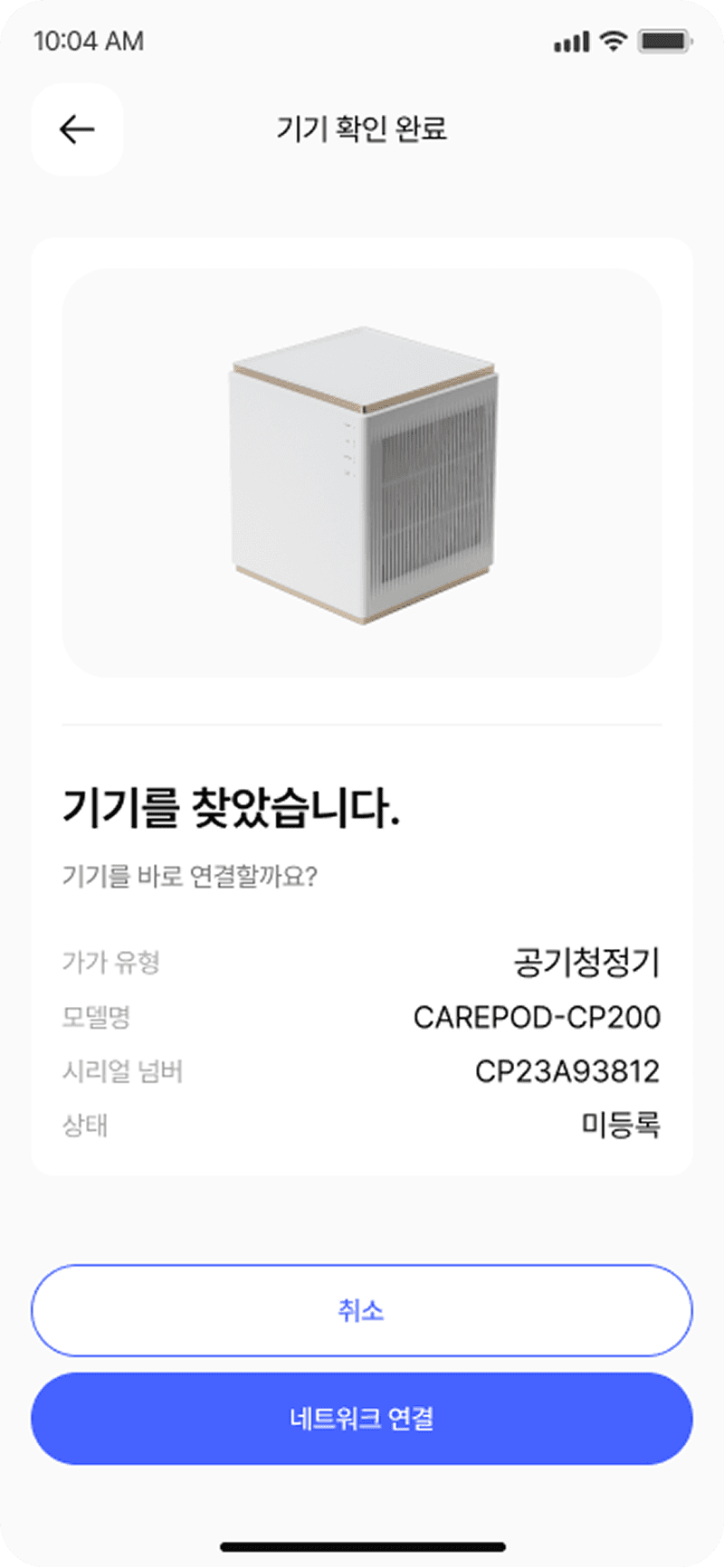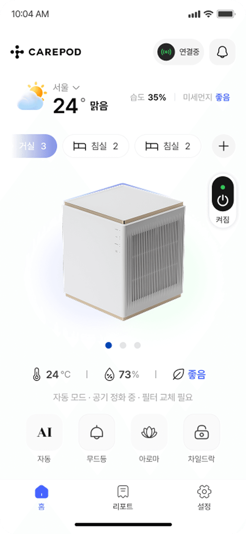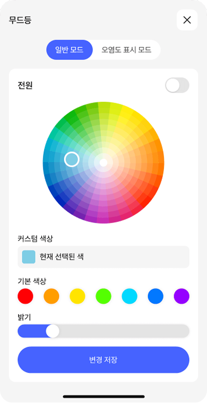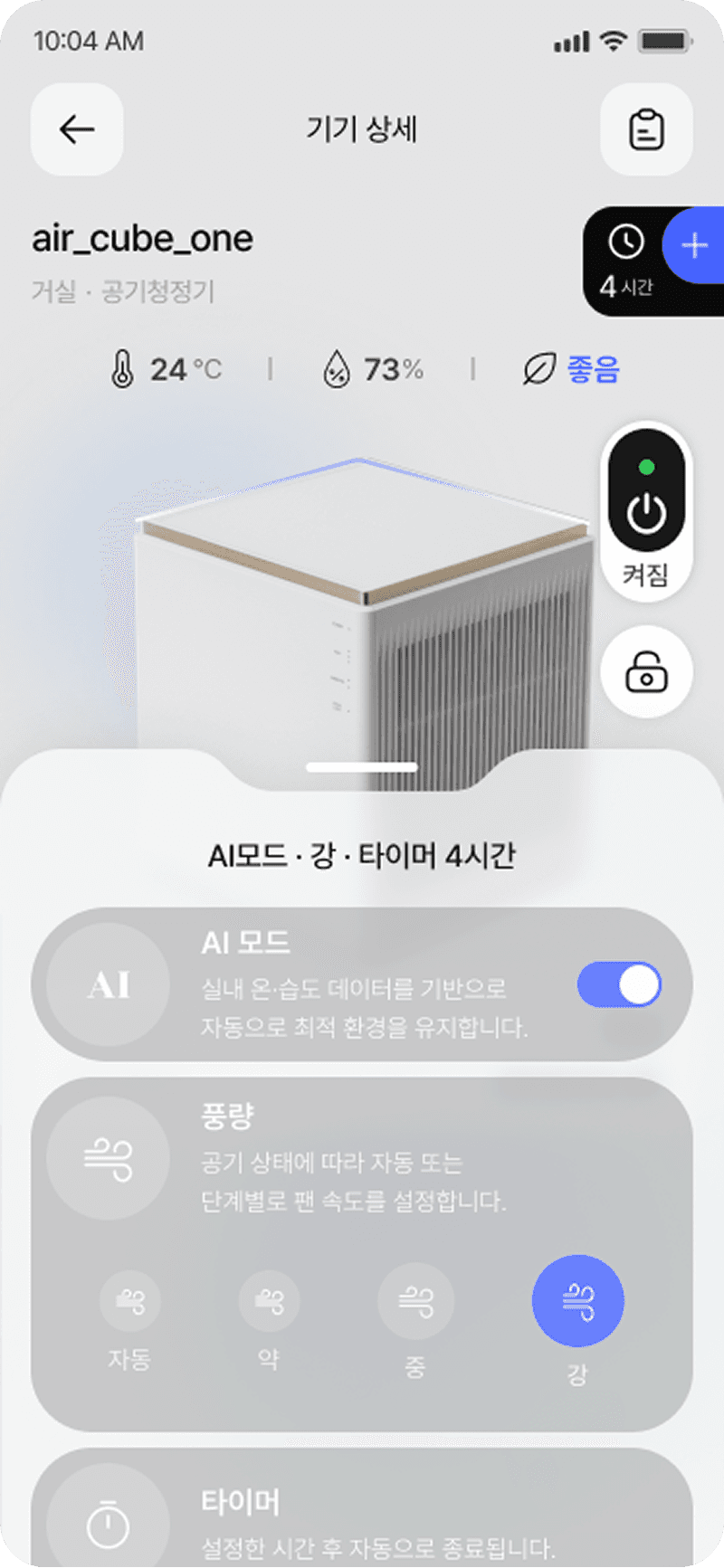 공기청정기의 전원, 풍량, 모드, 타이머 등을 직관적으로 제어할 수 있는 UI 제공