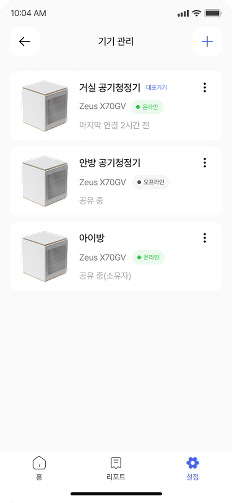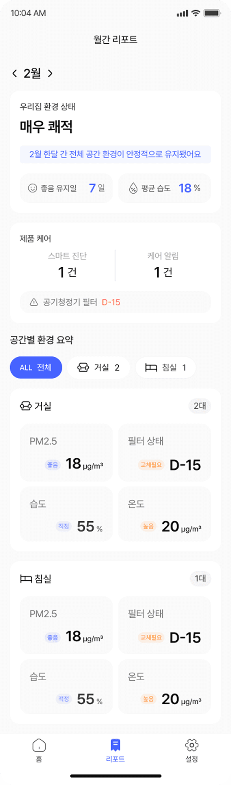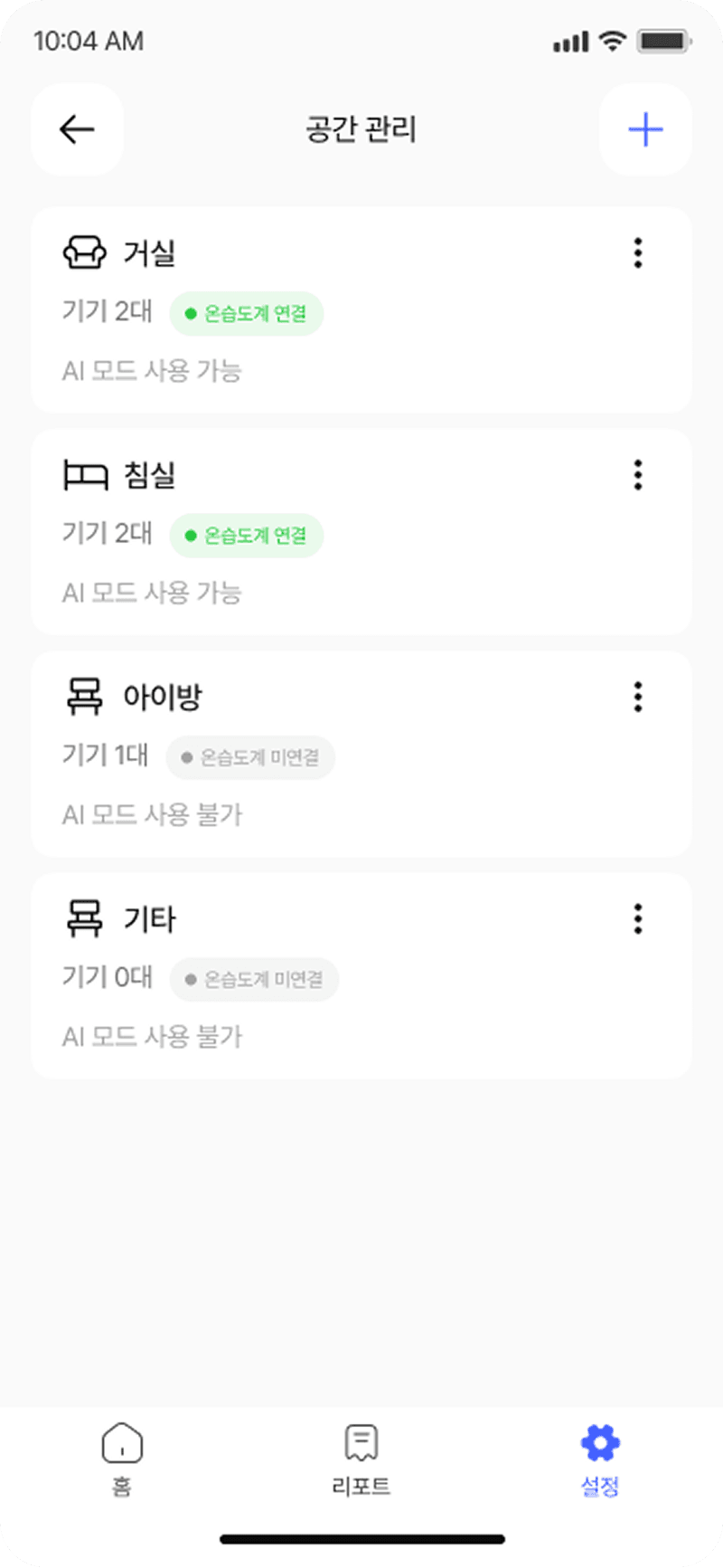 기기를 거실, 침실 등 공간 단위로 그룹화하여 환경 상태와 함께 통합 관리