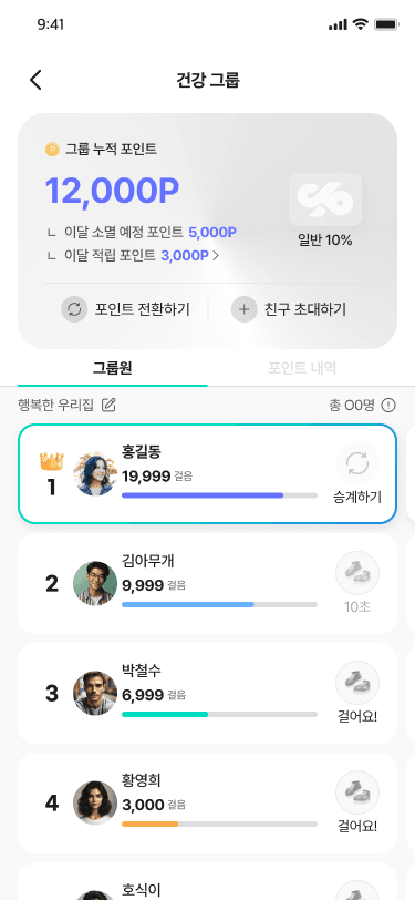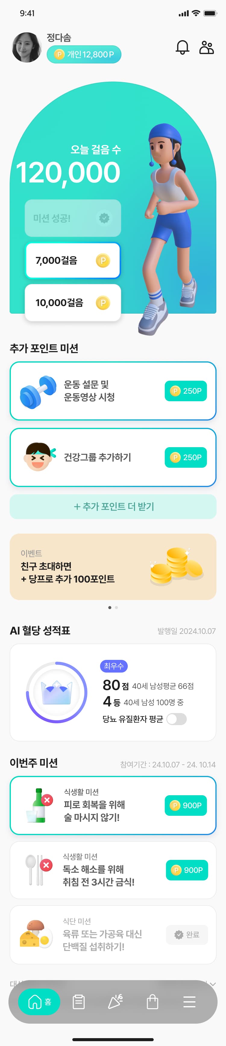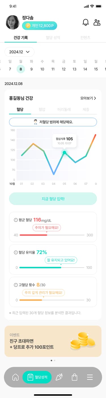 걸음 수, 혈당, 혈압, 허리둘레, 체중 등 파편화된 핵심 지표를 한눈에 파악할 수 있는 데이터 분석 및 시각화 뷰어 제공.