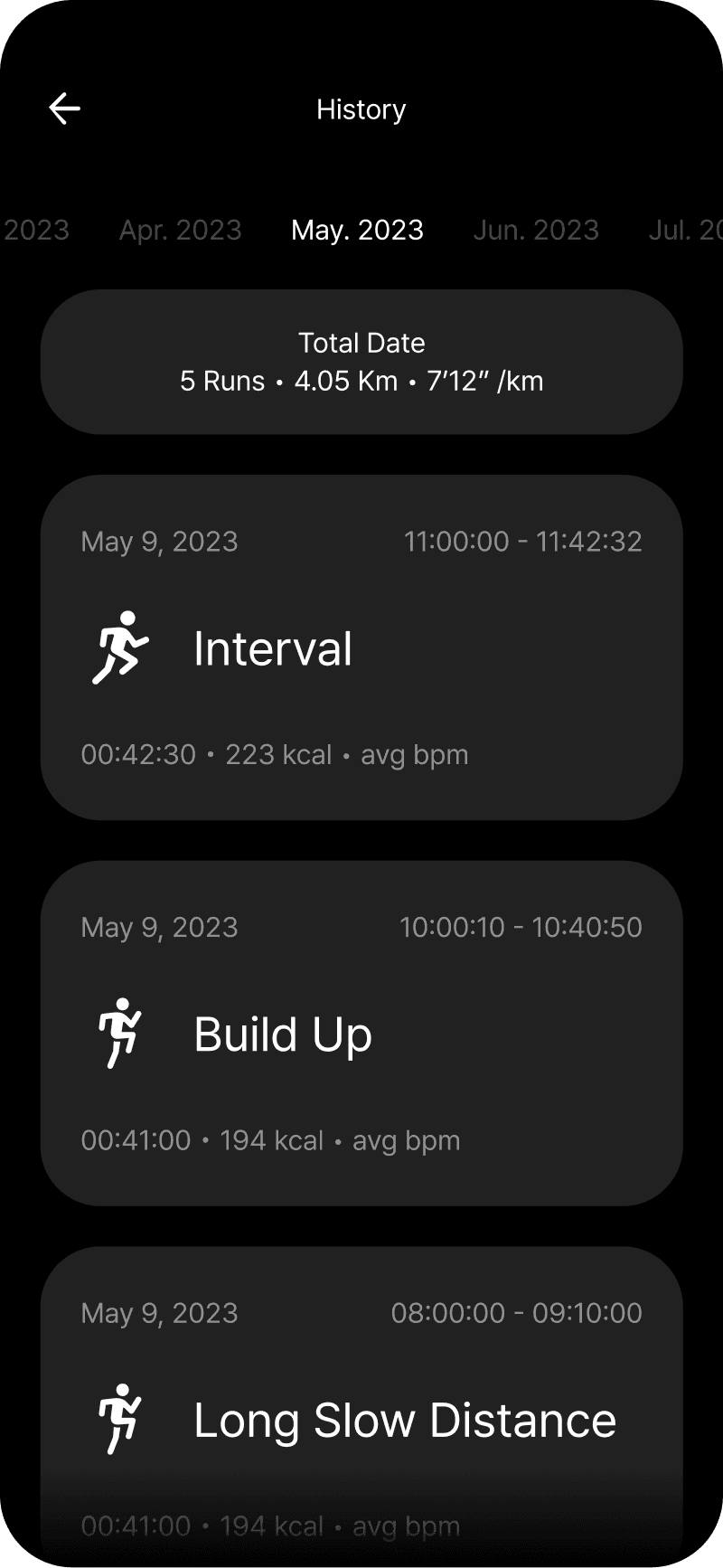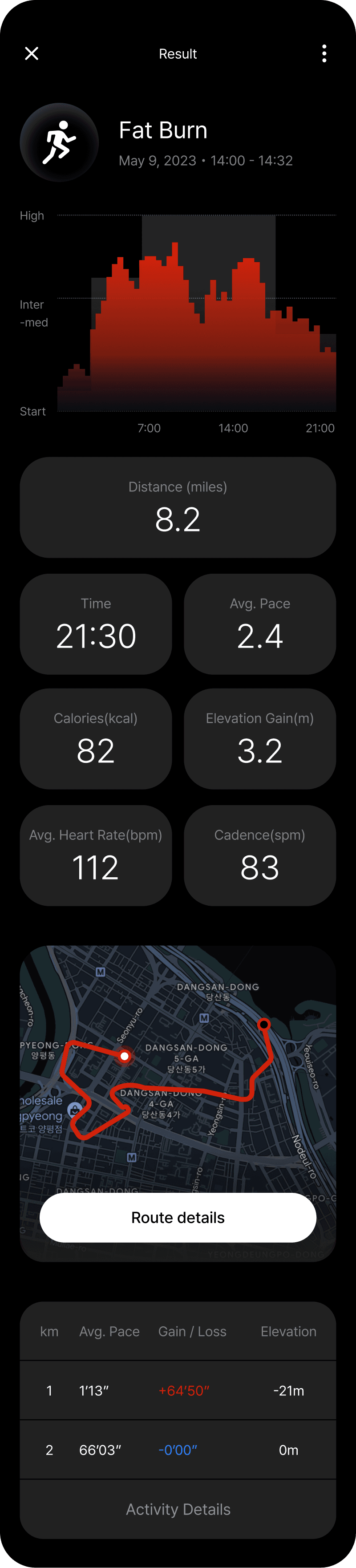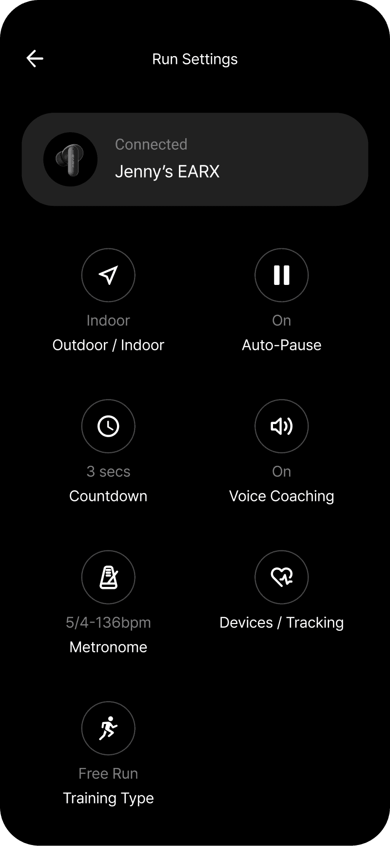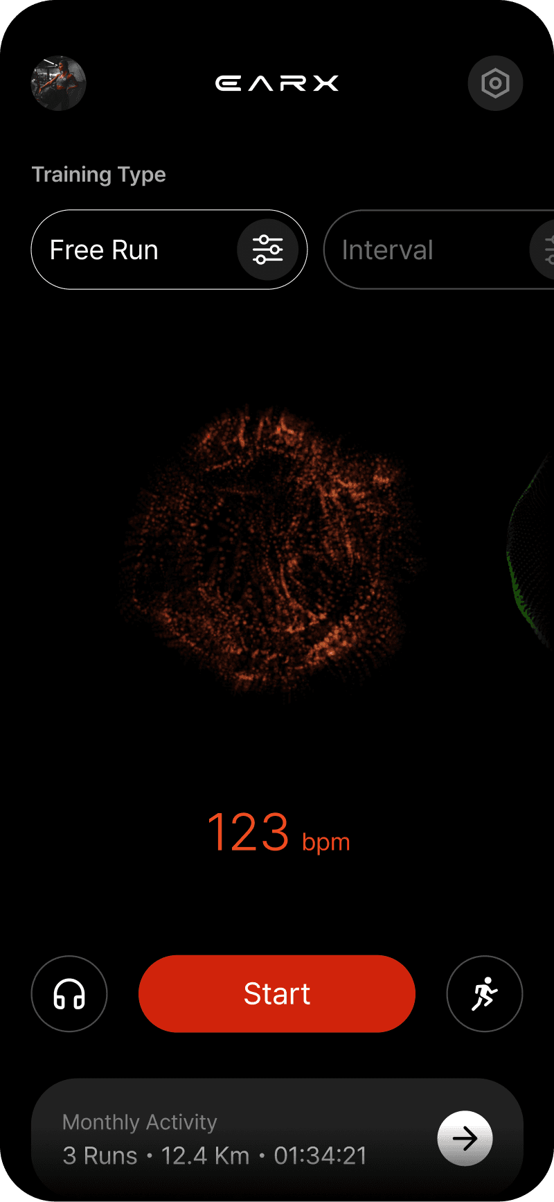 이어폰 센서를 통해 실시간 심박수(BPM), 케이던스, 페이스 등을 정밀 측정하고 시각화된 활동 리포트 제공.