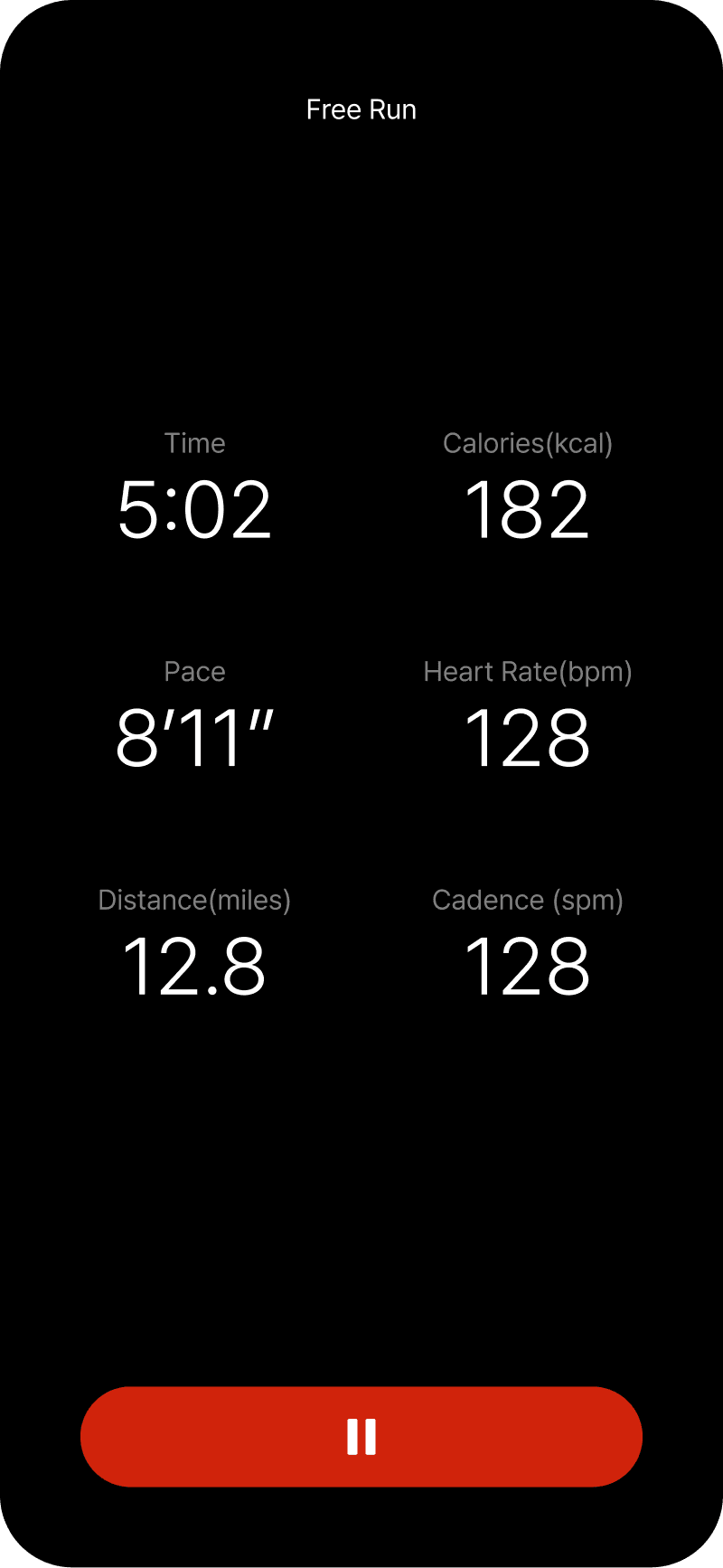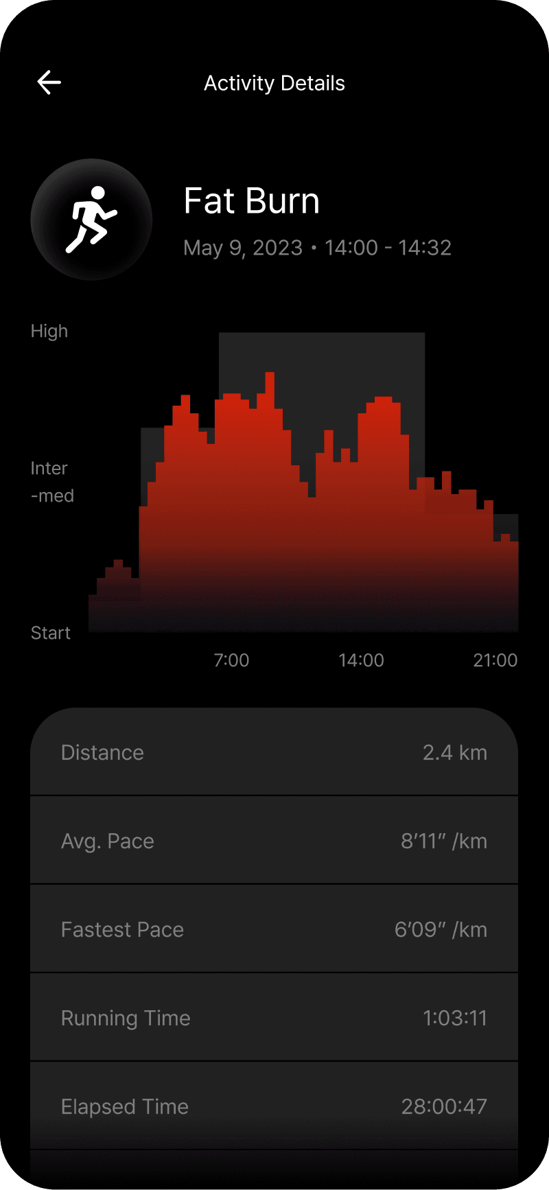 운동 중 시인성을 높이기 위해 고대비 다크 모드를 적용하고, 핵심 수치(심박수, 거리)에 강렬한 포인트 컬러를 사용하여 몰입감 있는 경험 제공