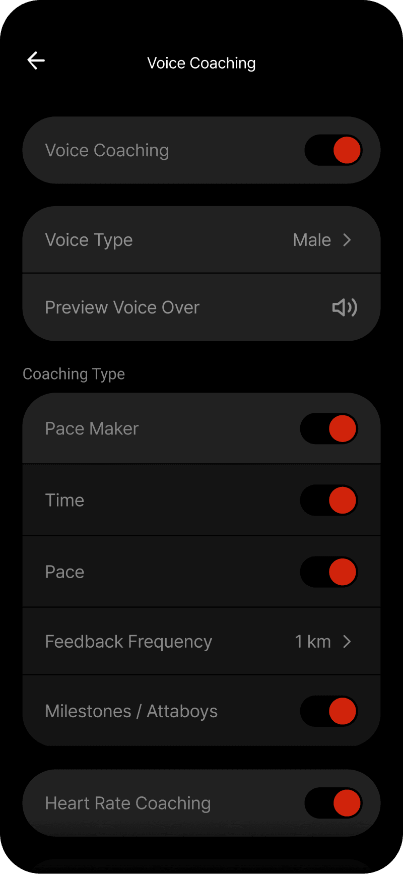 보이스 코칭의 성별, 피드백 빈도, 자동 일시정지 등 전문 러너들의 요구사항을 반영한 세밀한 환경 설정 로직 구현